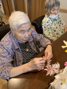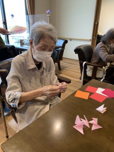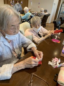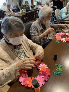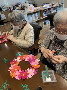 コスモスリース 2025年9月13日 ブログ 喜楽の家デイサービスセンターです。 折り紙でコスモスを制作中! 台紙にコスモスの花と葉をバランスよく貼っていきます! 素敵なリースが完成しましたo(^▽^)o ありがとうございました♪ 投稿ナビゲーション Previous Previous post: 運動と制作Next Next post: 敬老の日
