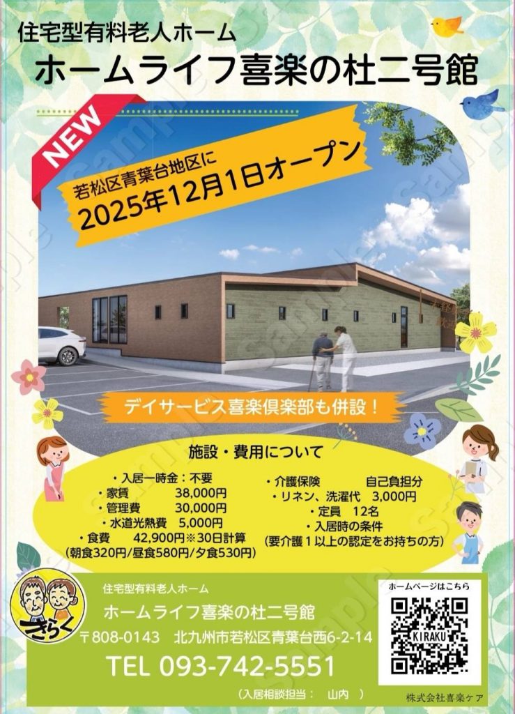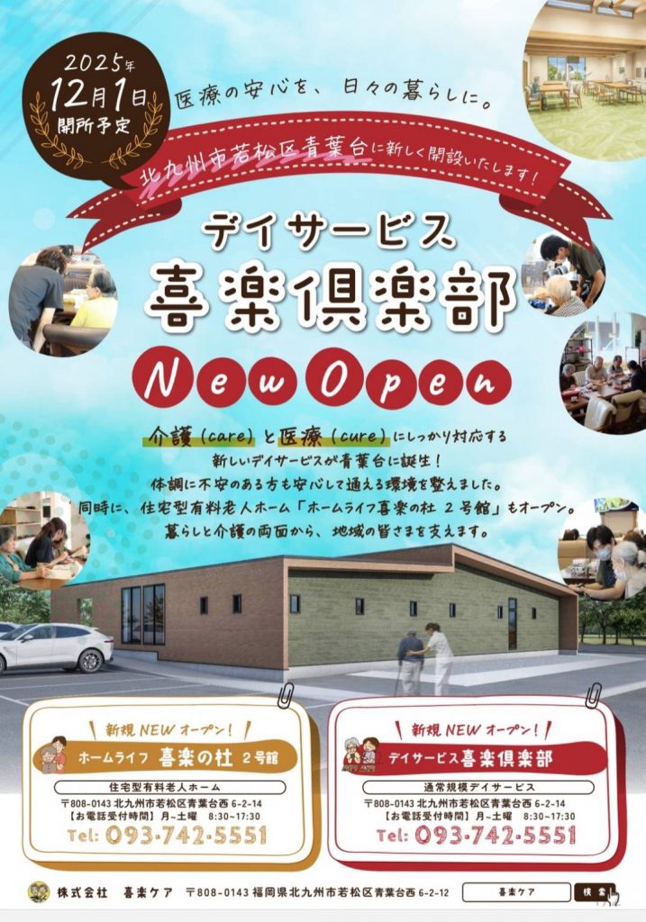 新施設 2025年11月1日 ブログ 喜楽の家デイサービスセンターです。 喜楽倶楽部(デイサービスセンター) 喜楽の杜二号館(住宅型有料老人ホーム) オープンまで1ヶ月を切りました! お問い合わせは 093-742-5551(山内)まで よろしくお願いいたします。 投稿ナビゲーション Previous Previous post: 喜楽の家デイサービスセンター11月の空き情報Next Next post: 菊花展
