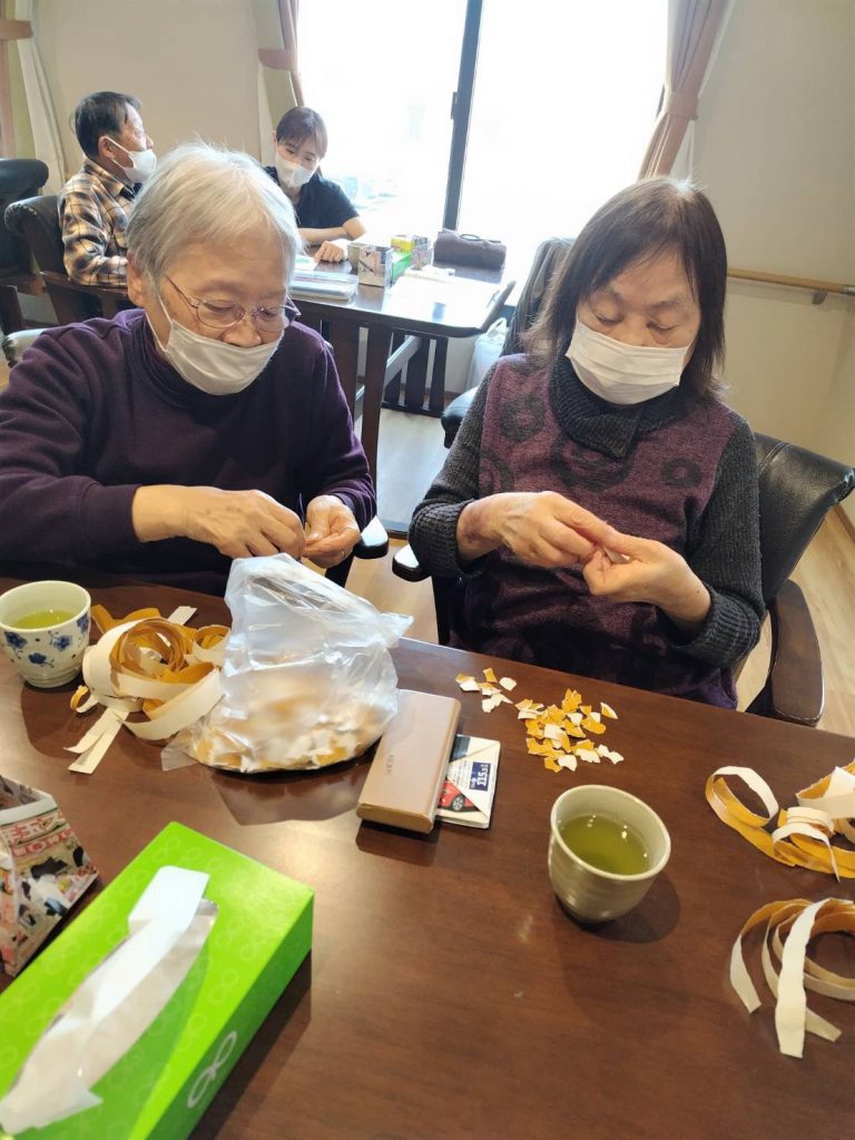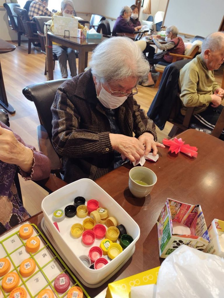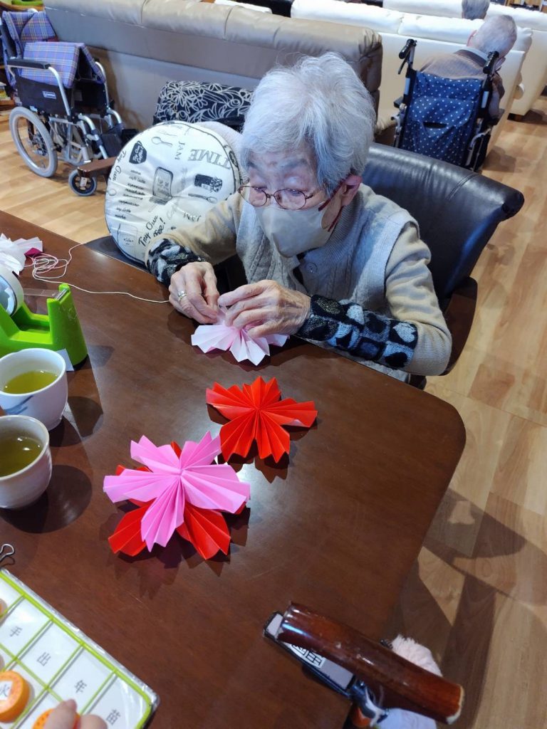 先日、折り紙が得意な利用者さまから習った『こま』を皆さまと一緒に折りました!